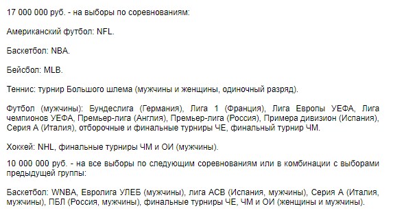 Здесь мы видим, что в рамках футбола можно выиграть 17 млн. по одной ставке, а вот уже в рамках баскетбола эта сумма снижается до 10 млн., а по лошадиным скачкам лимит установлен в 3.3 млн.
