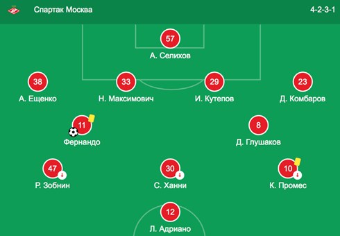 Спартак начал по схеме 4-2-3-1, где на острие атаки играл Адриано.