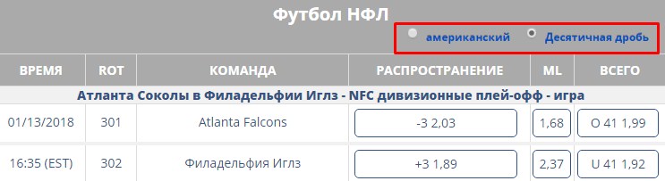 При открытии линии, отображаются американские коэффициенты, на представленном ниже скрине показано, как легко их поменять на десятичные.