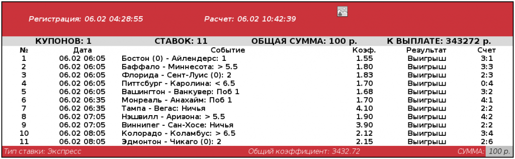Беттор разместил ставку типа «экспресс» в букмекерской компании «Фонбет». В неё были включены чистые победы, тоталы и форы по 11 матчам Национальной хоккейной лиги, игравшимся в одну ночь.